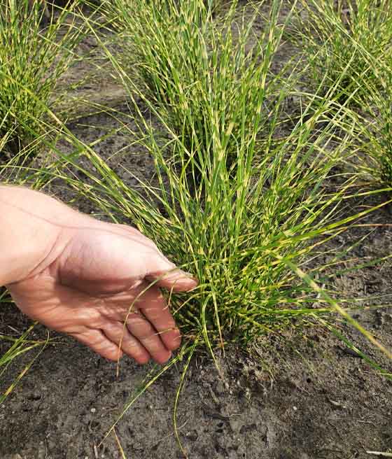 Roślina tworzy gęste, zwarte kępy złożone z wąskich, zielonych liści ozdobionych poprzecznymi, kremowo-żółtymi paskami. Ten charakterystyczny wzór nadaje jej egzotyczny i dynamiczny wygląd, który wyróżnia się na tle innych traw ozdobnych.