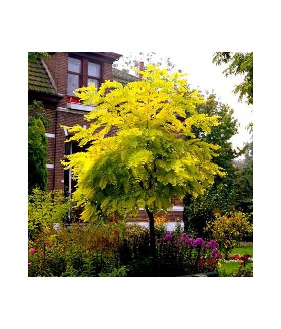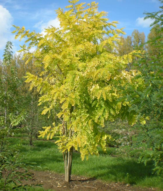 Rośnie jako średniej wielkości drzewo o dość regularnej, lekko ażurowej koronie. W polskich warunkach osiąga zwykle 8–10 m wysokości. Liście są pierzaste, jasnożółte od wiosny, latem przechodzą w żółtozielony odcień, a jesienią stają się jaśniejsze i delikatniejsze w kolorze. Pokrój drzewa jest luźny, co sprawia, że korona nie daje ciężkiego cienia i dobrze przepuszcza światło.
