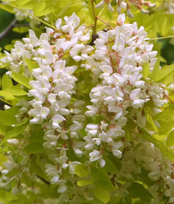 Kwitnienie przypada na maj i początek czerwca. Kwiaty są białe, motylkowate, zebrane w zwisające grona i przyjemnie pachną. Choć nie są główną ozdobą tej odmiany, stanowią atrakcyjny dodatek do intensywnego koloru liści i są chętnie odwiedzane przez owady zapylające.