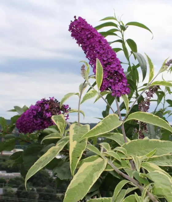 Budleja Davida 'Harlequin' (Buddleja davidii) to odmiana ozdobna nie tylko z kwiatów, ale także z atrakcyjnych, dwukolorowych liści. W czasie kwitnienia przyciąga chmary motyli. Dlatego jest potocznie nazywana „motylim krzewem”.