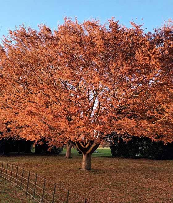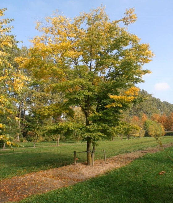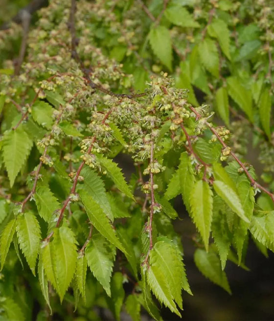 Rośnie jako średniej wielkości drzewo o szerokiej, rozłożystej koronie i wyraźnym pniu. Docelowo osiąga około 5–8 m wysokości. Liście są drobne, eliptyczne, ząbkowane na brzegach, w sezonie intensywnie zielone. Jesienią przebarwiają się na odcienie żółci, pomarańczu i czerwieni, co nadaje drzewu wyraźny walor dekoracyjny. Pokrój jest harmonijny i czytelny nawet bez regularnego cięcia.