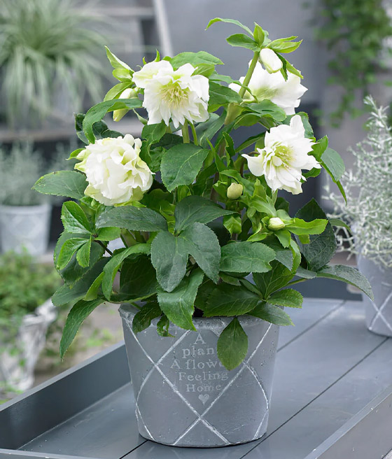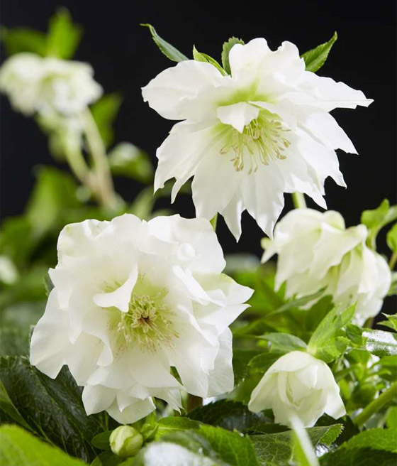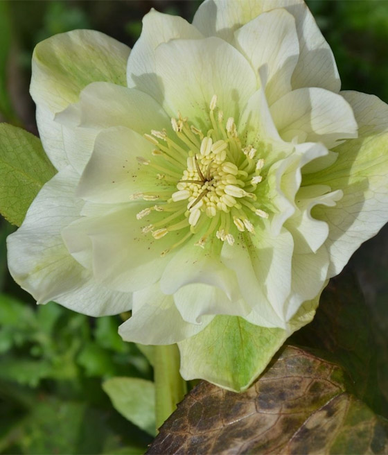 Kwitnie od lutego do kwietnia, wytwarzając pełne, duże kwiaty w śnieżnobiałym kolorze. Płatki są delikatnie wywinięte na zewnątrz, tworząc eleganckie, gęste kwiatostany unoszące się nad liśćmi. W czasie kwitnienia roślina wydziela subtelny, przyjemny, lekko słodkawy zapach, który dodaje wnętrzu ogrodu ciepła i świeżości.