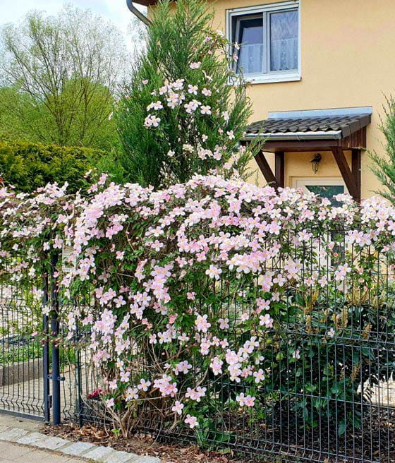 Powojnik 'Rubens' kwitnie od maja do czerwca, oferując intensywne, różowe kwiaty, które wprowadzają wiosenny akcent do ogrodu. Kwitnienie tej odmiany jest obfite i trwa przez kilka tygodni, tworząc prawdziwą ścianę kwiatów, co czyni go atrakcyjnym punktem w ogrodzie.