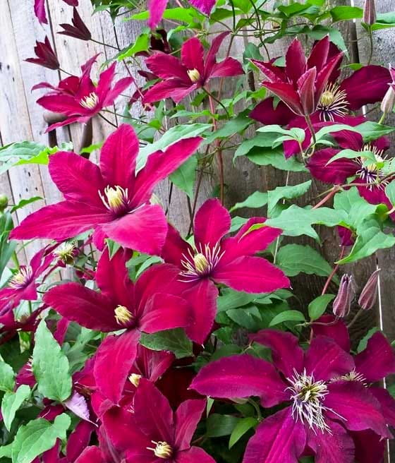 Powojnik 'Niobe' to pnącze o szybkim wzroście, które może osiągnąć wysokość od 2 do 3 metrów, tworząc efektowną zasłonę kwiatów. Jego kwiaty są średniej wielkości, o intensywnym rubinowo-czerwonym kolorze, które nadają roślinie wyrazisty, niemal elegancki wygląd. Płatki kwiatów są wąskie i lekko falowane na brzegach, co nadaje im zwiewności. Kwiaty pojawiają się obficie przez całe lato, tworząc z rośliny spektakularną ozdobę ogrodu. Liście powojnika są ciemnozielone, błyszczące, co doskonale kontrastuje z intensywnymi kwiatami, tworząc piękne tło.