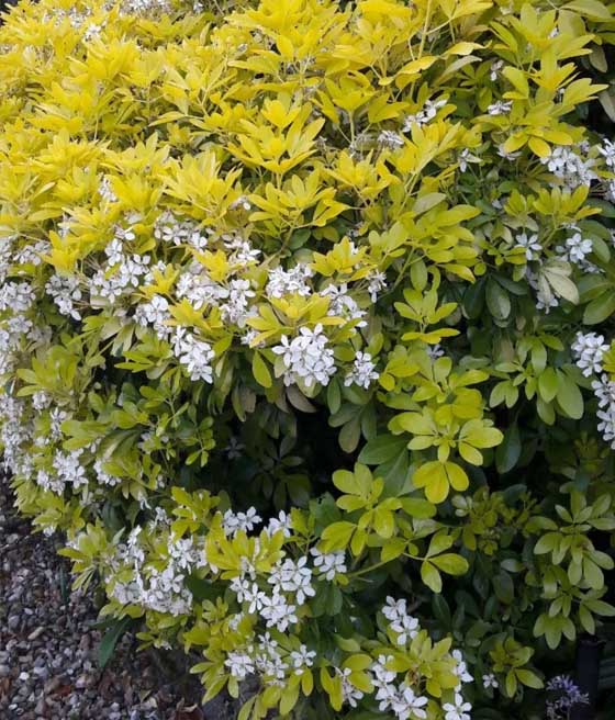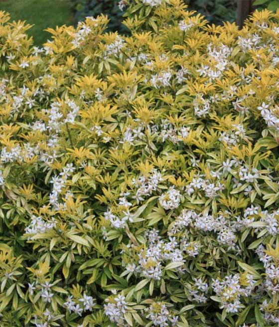 W maju krzew obsypuje się białymi, gwiazdkowatymi kwiatami zebranymi w niewielkie kwiatostany. Wydzielają wyraźny, cytrusowy zapach, kojarzący się z kwiatami pomarańczy. W sprzyjających warunkach możliwe jest także powtórne, słabsze kwitnienie pod koniec lata.