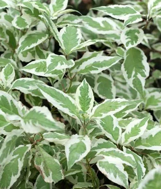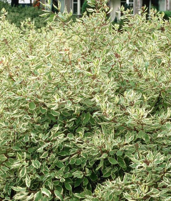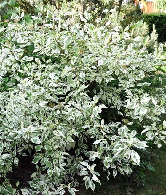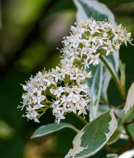 Dereń biały ‘Elegantissima’ kwitnie pod koniec maja i na początku czerwca.