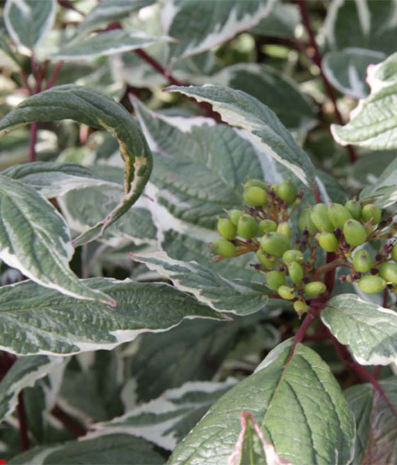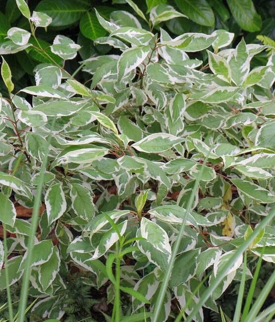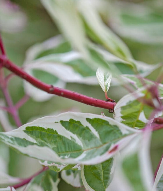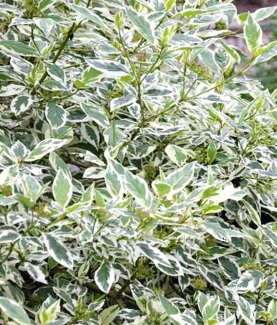 Dereń biały (Cornus alba 'Sibirica Variegata') to ozdobny krzew o zielonych liściach z kremowym obrzeżeniem i intensywnie czerwonych pędach dekoracyjnych zimą. Jest łatwy w uprawie, odporny na mrozy i efektowny przez cały rok, dzięki czemu doskonale ożywia ogród.