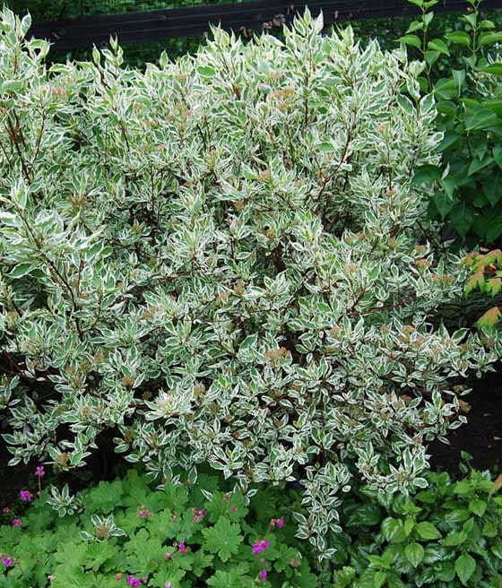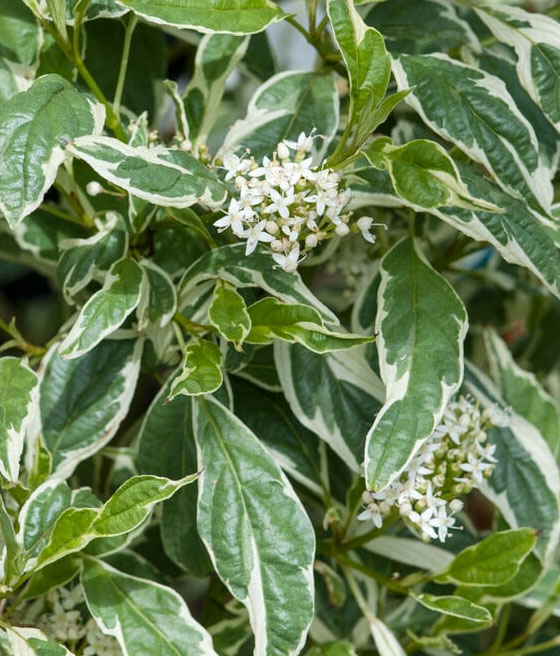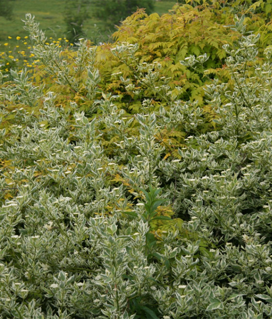 Dereń rozłogowy ‘White Gold’ kwitnie w maju.