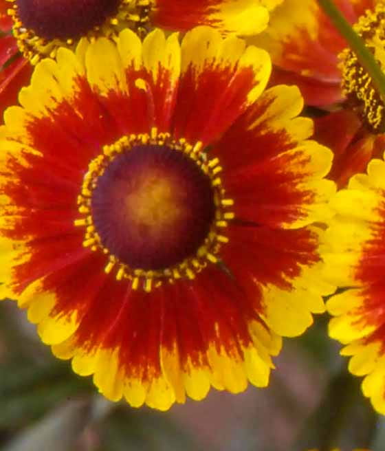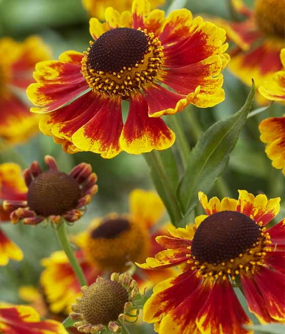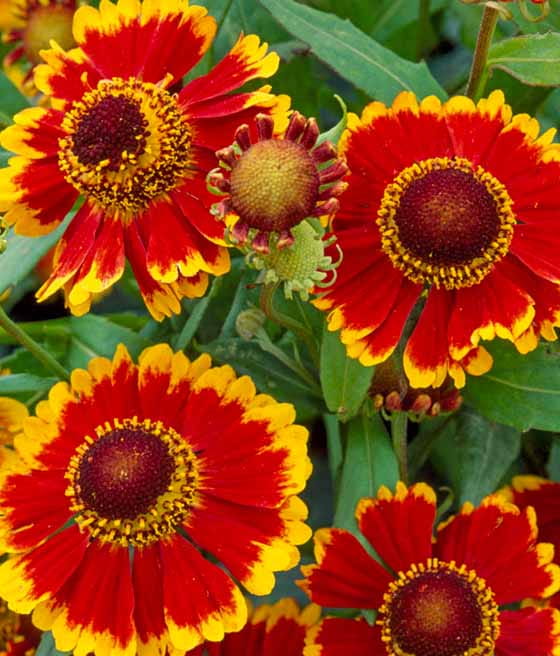 Dzielżan 'Biedermeier' osiąga wysokość do 130 cm, tworząc rozłożyste kępy. Liście są zielone, lancetowate, ząbkowane, co nadaje roślinie subtelną teksturę. Kwiaty są intensywnie czerwone z żółtym obrzeżeniem, zebrane w gęste kwiatostany, które tworzą efektowną, barwną chmurę w ogrodzie.