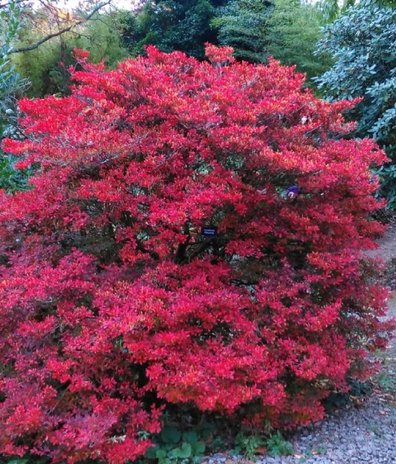 Krzew rośnie powoli i harmonijnie, tworząc luźną, lekko rozłożystą formę z charakterystycznym, warstwowym układem pędów. Osiąga około 1,5–2 m wysokości i podobną szerokość. Liście są eliptyczne, jasnozielone, zebrane w skupieniach na końcach gałązek. Jesienią przebarwiają się niezwykle efektownie na intensywne odcienie czerwieni, pomarańczu i purpury.