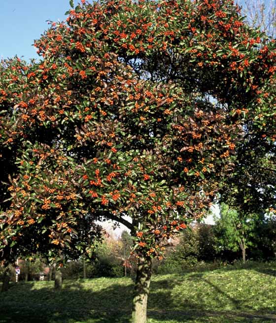 Rośnie jako niewielkie drzewo o zwartej, lekko stożkowatej koronie. Osiąga zwykle 5–7 metrów wysokości i podobną szerokość. Liście są błyszczące, ciemnozielone, grube, jesienią przebarwiają się na żółto i pomarańczowo. Roślina zachowuje uporządkowany wygląd bez konieczności regularnego cięcia, dzięki czemu dobrze sprawdza się także w zieleni miejskiej.