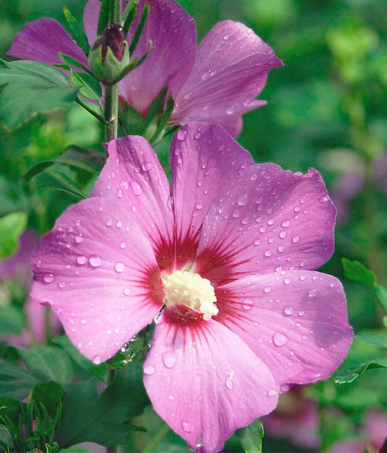 Hibiskus, ketmia syryjska ‘Russian Violet Floru’ (Hibiscus syriacus) to odmiana obficie kwitnąca o ciepłej barwie kwiatów. Nadaje się m.in. do tworzenia romantycznych zakątków w ogrodzie.