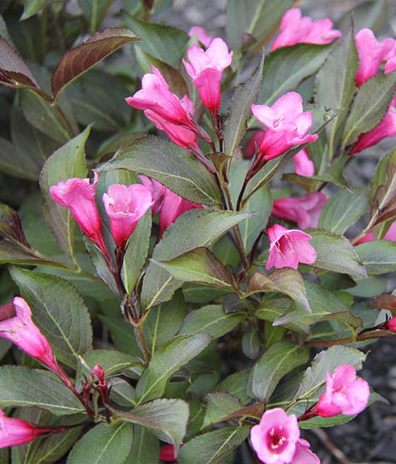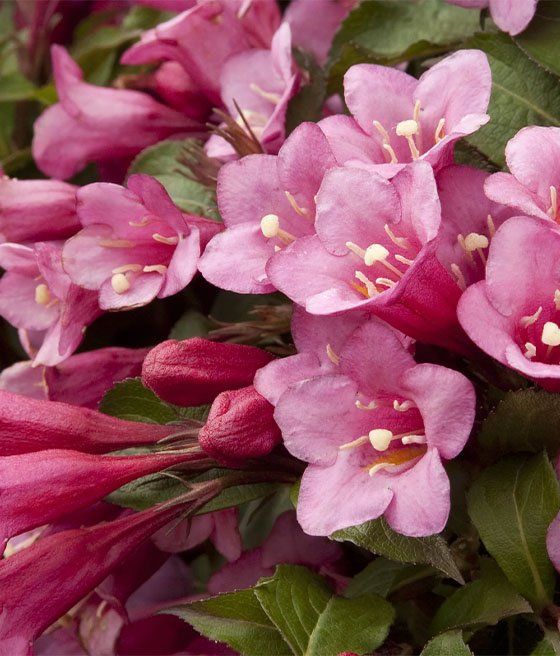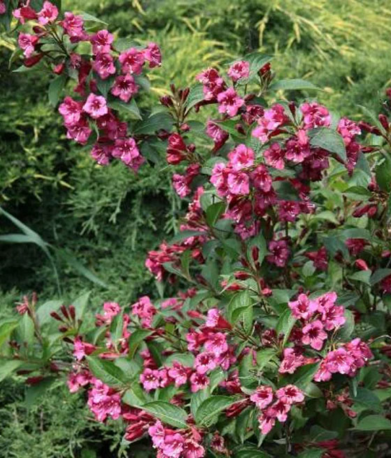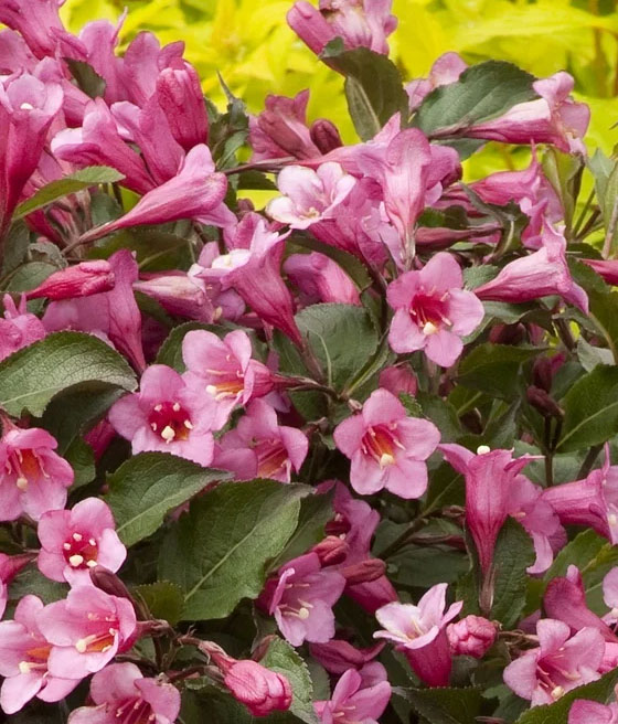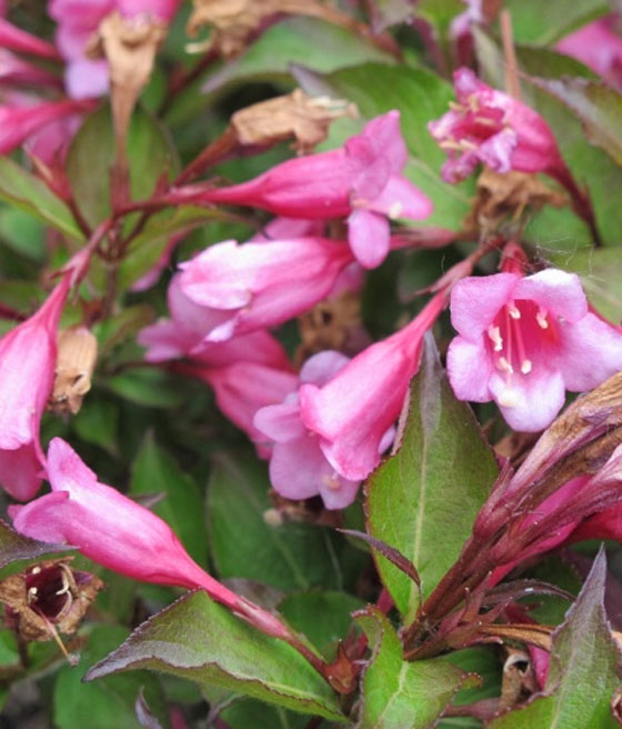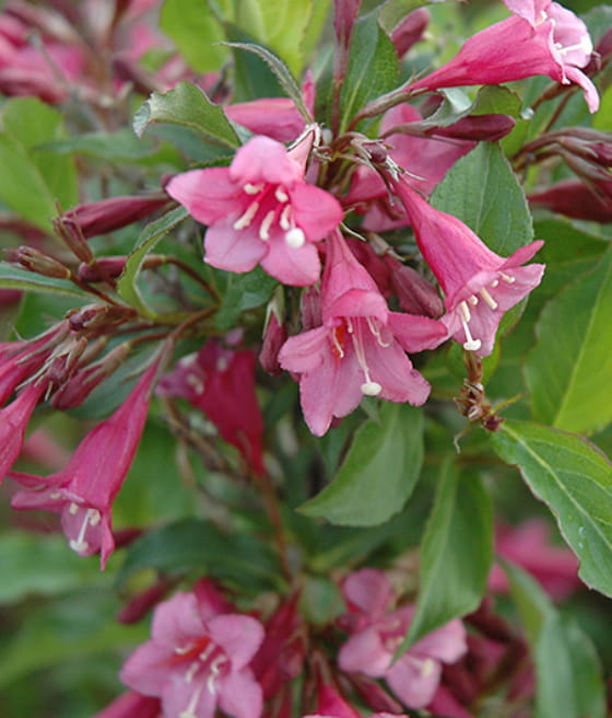 Krzewuszka cudowna ‘Minuet’ (Weigela florida) to wysoki krzew wytwarzający liczne, wąskie, lejkowate kwiaty. Jest mało rozłożysty. Kwitnie obficie.