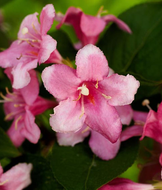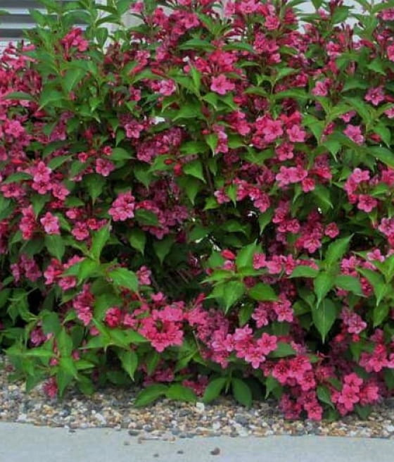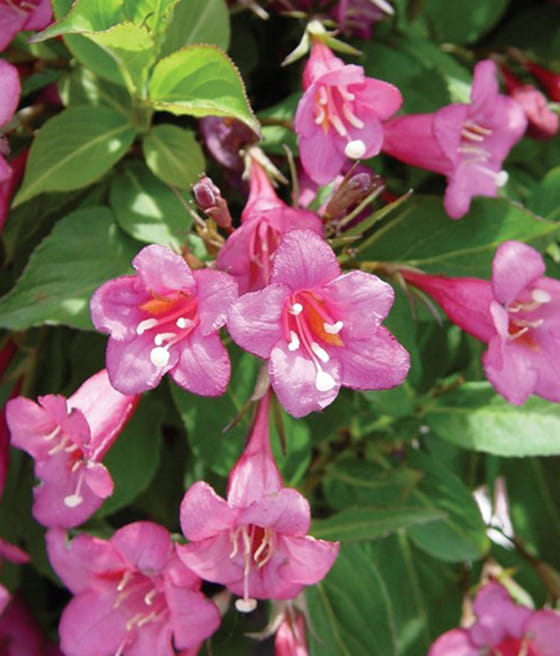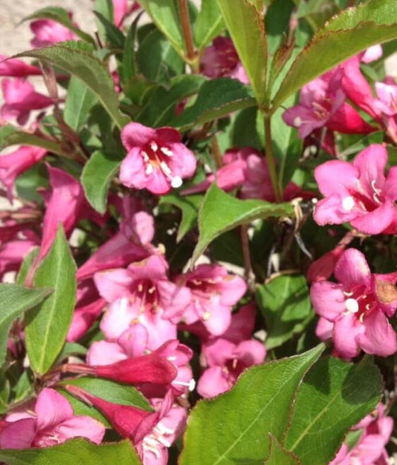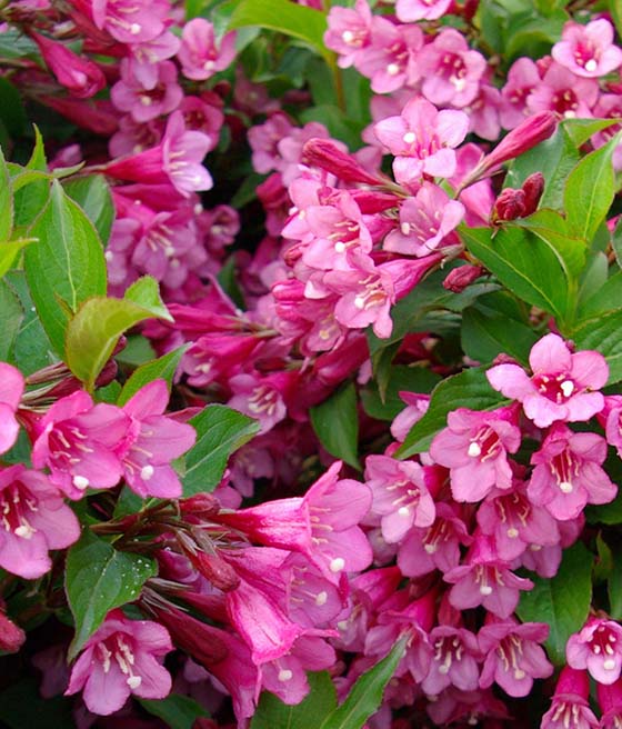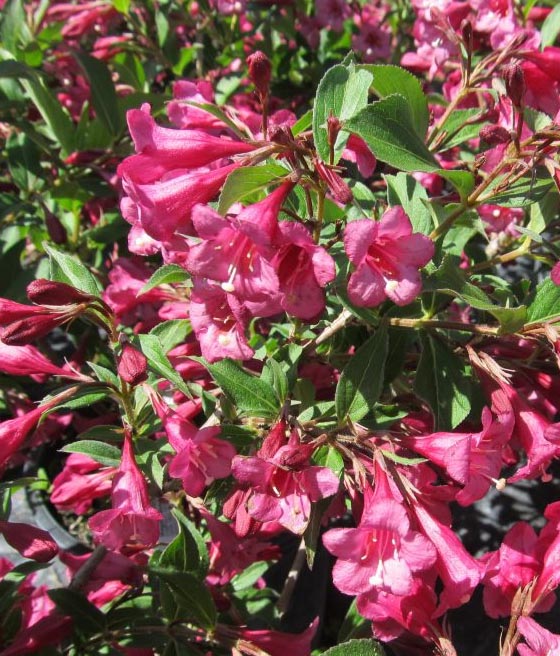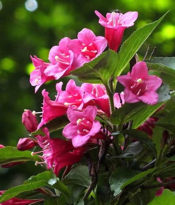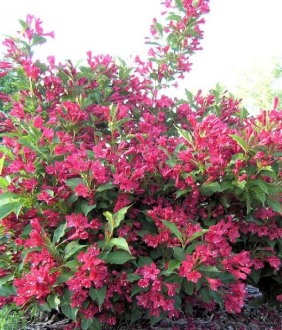 Krzewuszka cudowna ‘Rumba’ kwitnie nieco później od innych odmian, najczęściej od czerwca do lipca.