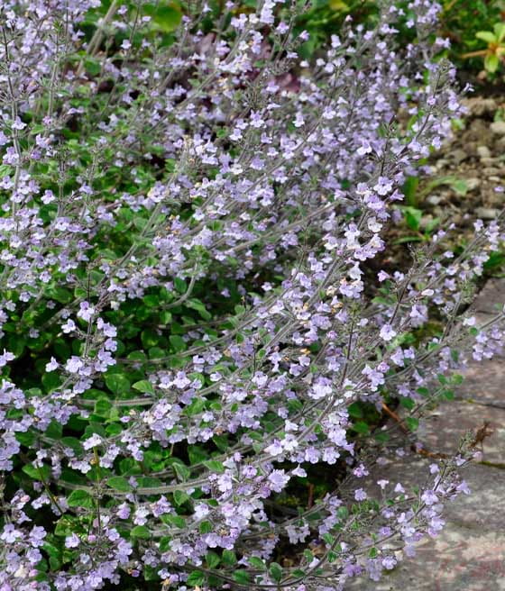 - Liście: Liście tej odmiany są szaro-zielone, sercowate, a ich zapach przypomina mięte, co czyni je przyjemnym elementem w ogrodzie. Liście są dekoracyjne przez cały sezon, a ich subtelny aromat uwalnia się po ich dotknięciu.