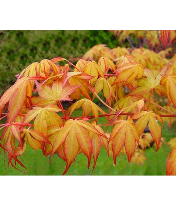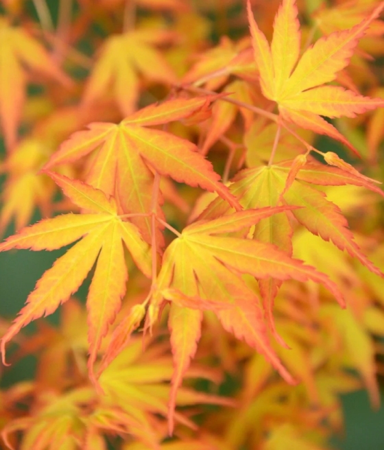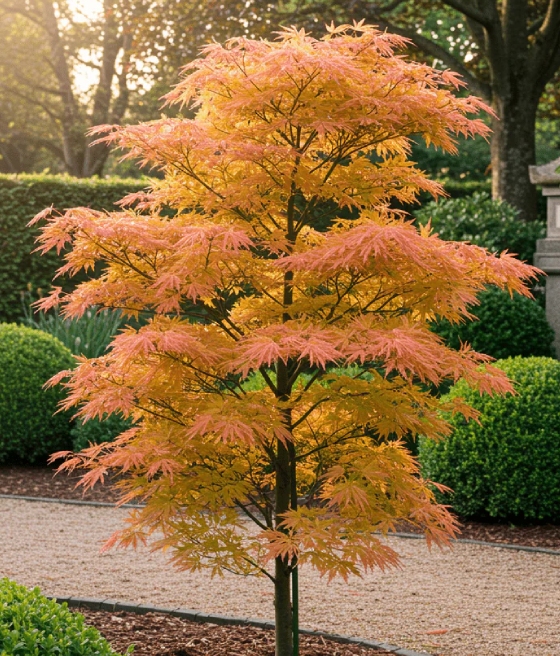 Klon palmowy Acer palmatum ‘Katsura’ wyróżnia się zmiennym wybarwieniem liści, które przyciąga uwagę od wczesnej wiosny aż do jesieni. Wiosną liście mają ciepłe, żółto-pomarańczowe odcienie, latem przechodzą w jaśniejszą zieleń, by jesienią ponownie nabrać intensywnych barw złota i pomarańczu. Dzięki temu roślina pozostaje dekoracyjna przez cały sezon.