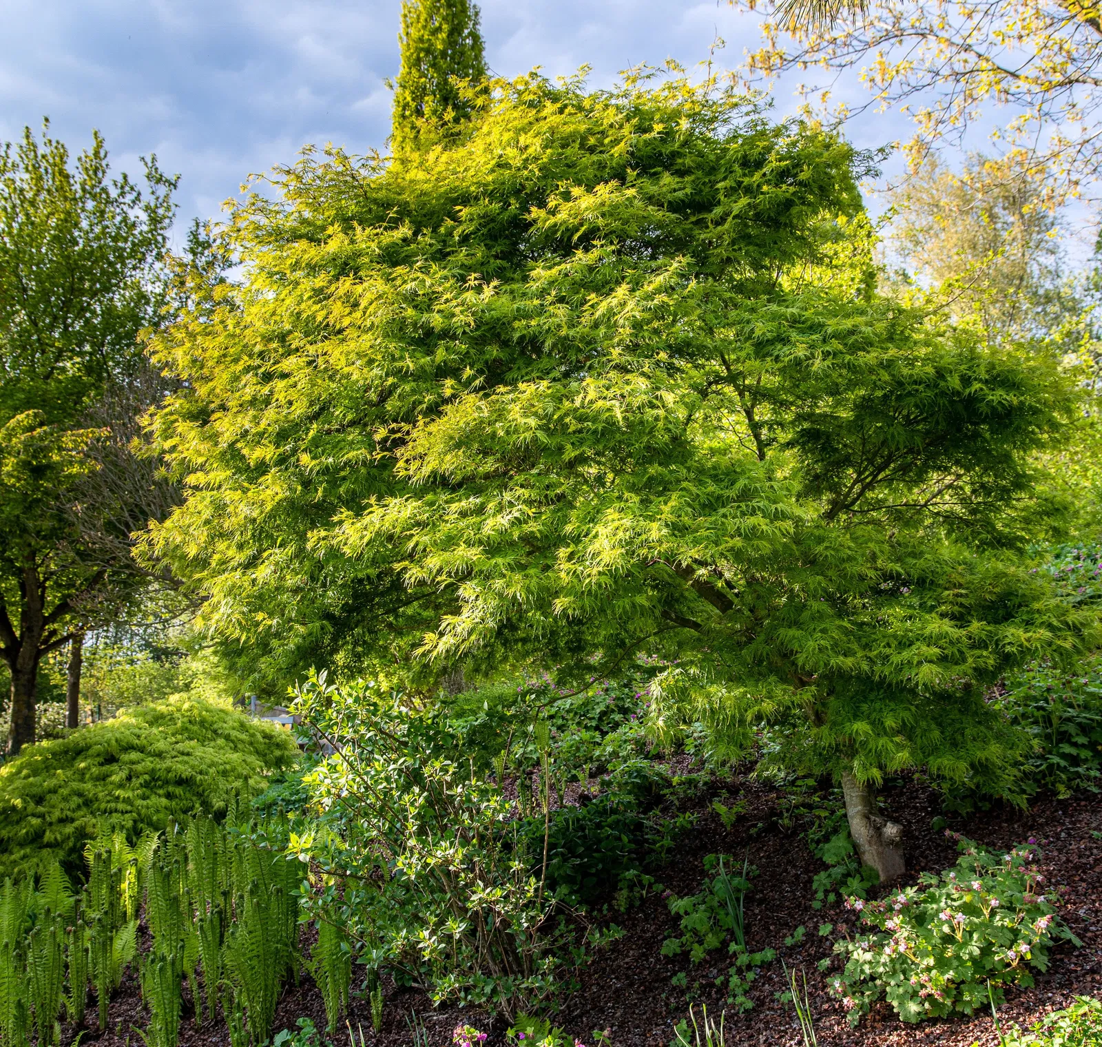 Dzięki wyprostowanemu pokrojowi i delikatnej strukturze liści świetnie sprawdza się jako soliter w mniejszych ogrodach. Pasuje do ogrodów japońskich, nowoczesnych i naturalistycznych, a także do nasadzeń przy tarasach i ścieżkach. Może być również uprawiany w dużych donicach, gdzie prezentuje się wyjątkowo lekko i elegancko.
