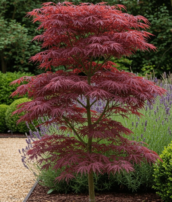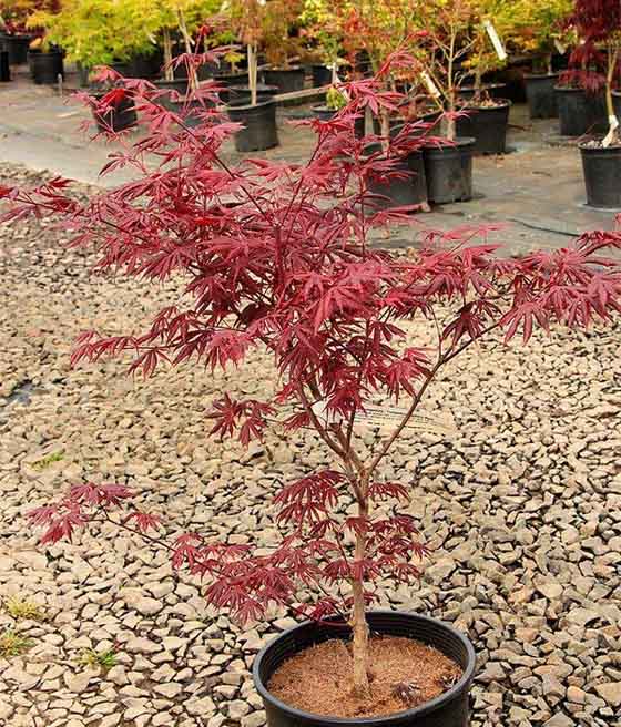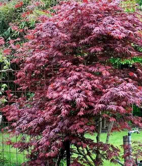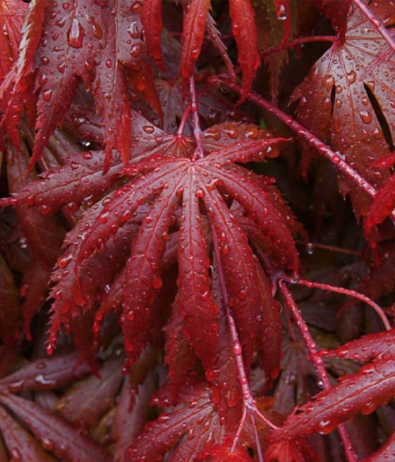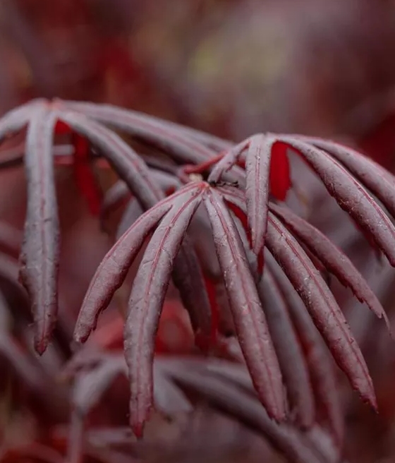 Klon palmowy Acer palmatum ‘Trompenburg’ to bardzo charakterystyczna odmiana o mocno wygiętych, niemal „podwiniętych” liściach, które nadają roślinie dynamiczny i nieco rzeźbiarski wygląd. Dzięki nietypowej formie liści oraz intensywnemu wybarwieniu stanowi wyrazisty akcent w ogrodzie już od wczesnej wiosny.