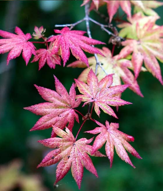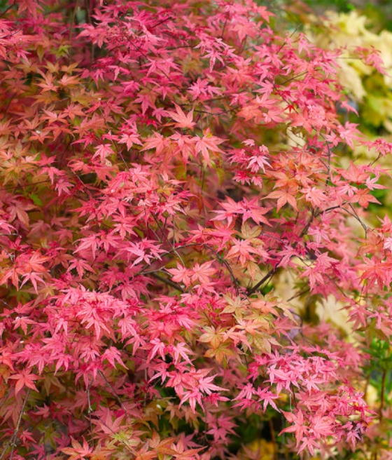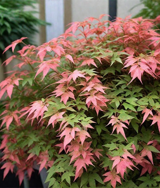 Klon palmowy (Acer palmatum ‘Beni-Maiko’) to kompaktowa i bardzo dekoracyjna odmiana klonu japońskiego, która wyróżnia się wyjątkowo dynamiczną zmiennością barw liści. Wiosną zachwyca intensywnymi, czerwono-różowymi przyrostami, latem łagodnieje, przechodząc w jaśniejsze odcienie z zielonym akcentem, by jesienią ponownie przyciągać wzrok ciepłymi tonami czerwieni, pomarańczu i złota. Dzięki temu pozostaje ozdobą ogrodu przez cały sezon.