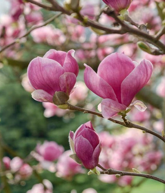 Magnolia pośrednia 'Rustica Rubra' to imponująca odmiana magnolii, będąca częścią popularnej grupy Magnolia × soulangeana. Odmiana ta wyróżnia się wyjątkowo intensywną barwą kwiatów, które łączą w sobie głębokie odcienie czerwieni i różu. Magnolia 'Rustica Rubra' jest ceniona za swoje obfite kwitnienie i wytrzymałość, co czyni ją doskonałym wyborem do różnych typów ogrodów, zarówno większych, jak i mniejszych.