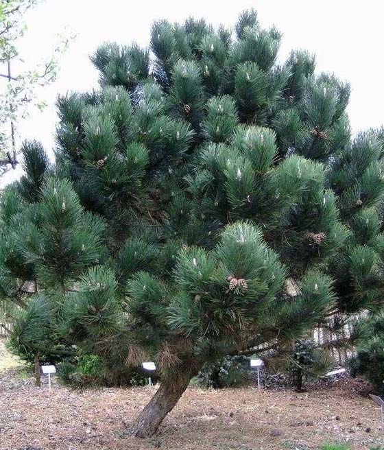 Tworzy prosty pień pokryty ciemnoszarą, spękaną korą. Igły są długie, grube, ciemnozielone, zebrane po dwie i utrzymują się na drzewie przez kilka lat.