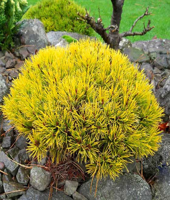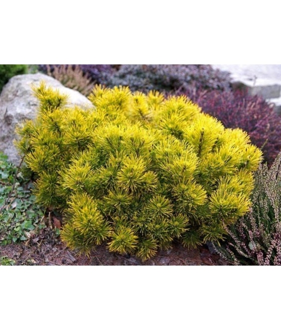 Pędy są krótkie i gęsto ułożone, a igły sztywne, zebrane po dwie, o długości kilku centymetrów. Największą ozdobą odmiany jest ich sezonowa zmiana barwy – od jasnozielonej wiosną i latem, po złocistożółtą jesienią i zimą.