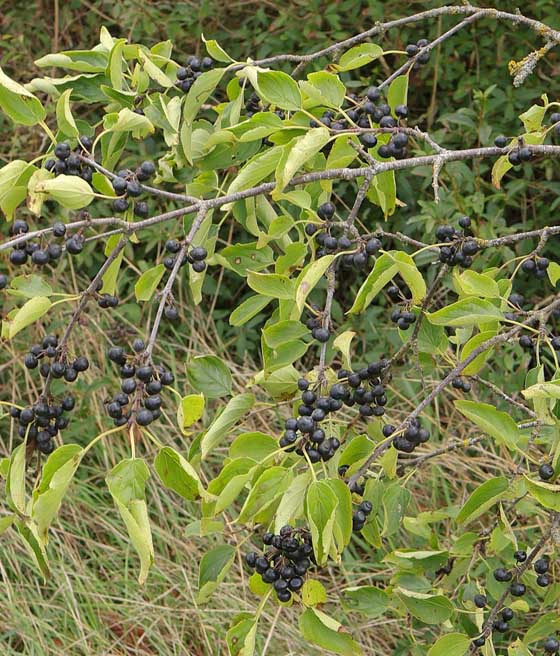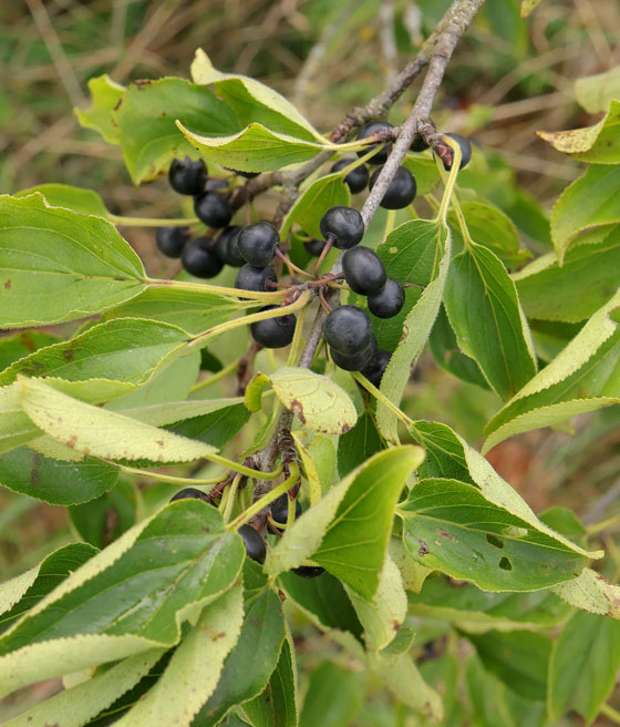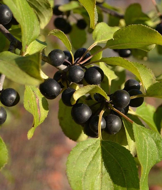 Szakłak pospolity (Rhamnus cathartica) to niewielkie drzewo lub krzew liściasty o dekoracyjnych liściach i czarnych owocach, cenione w ogrodach naturalistycznych i parkach.