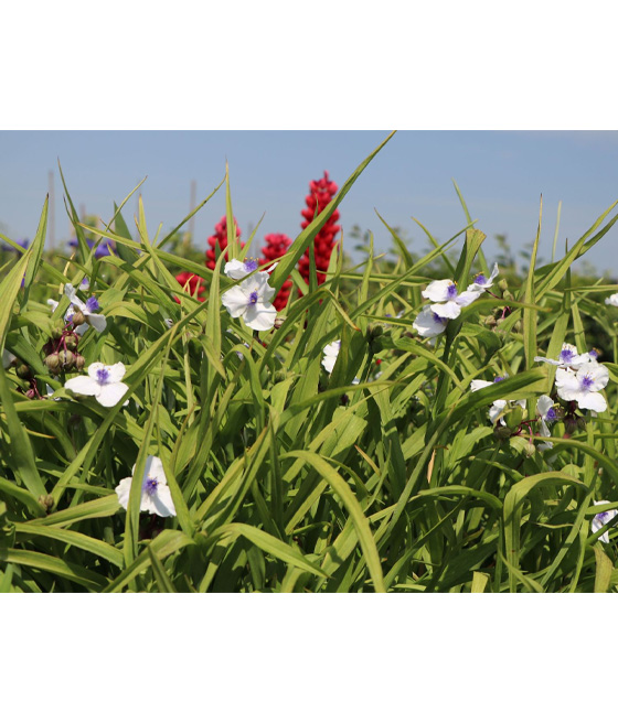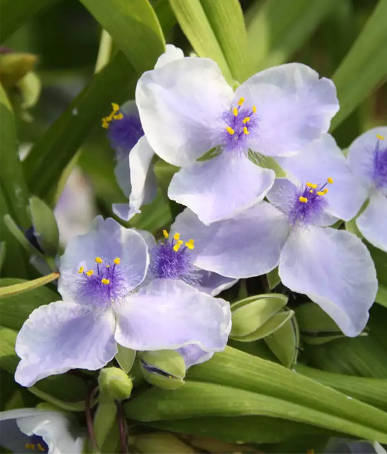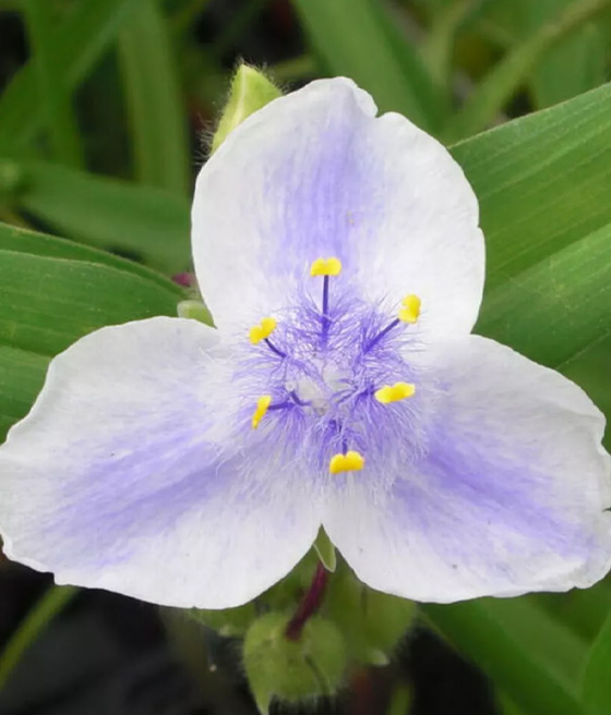 Trzykrotka Andersona Osprey (Tradescantia andersoniana 'Osprey') to dekoracyjna bylina ceniona w ogrodach za duże, białe kwiaty z niebieskim środkiem i wyraźnymi pręcikami.