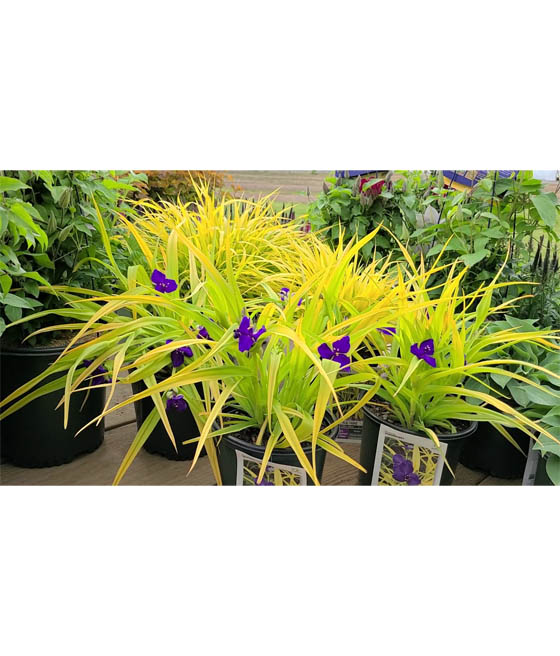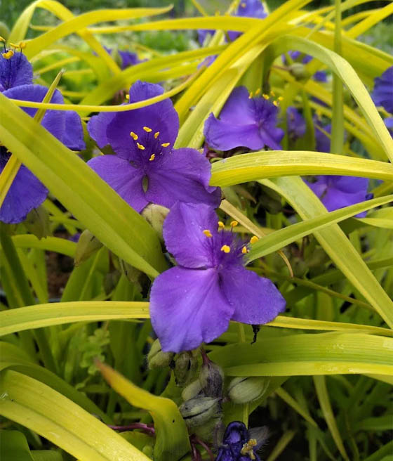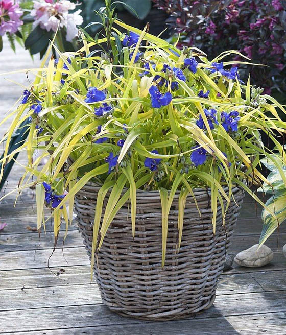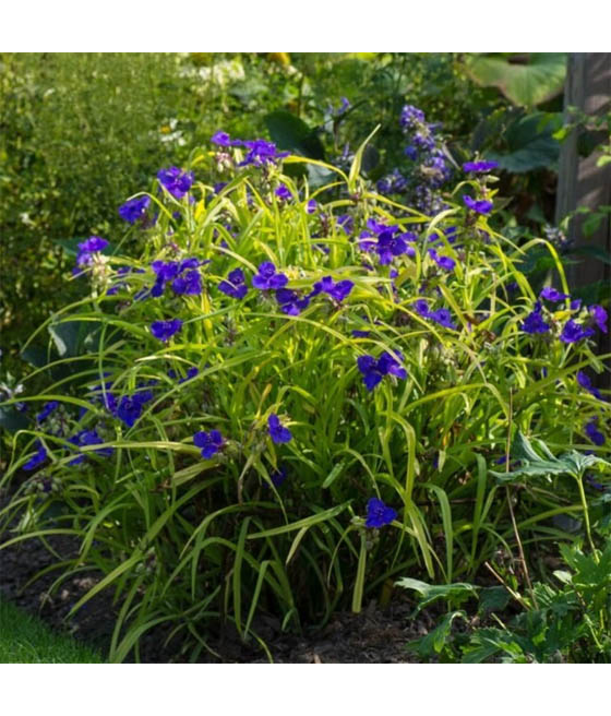 Trzykrotka Sweet Kate (Tradescantia x andersoniana ‘Sweet Kate’) to bylina ogrodowa, ceniona za kontrastowe połączenie intensywnie niebiesko-fioletowych kwiatów ze złotymi, wąskimi liśćmi.