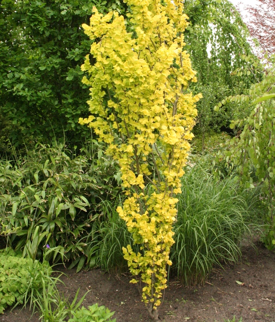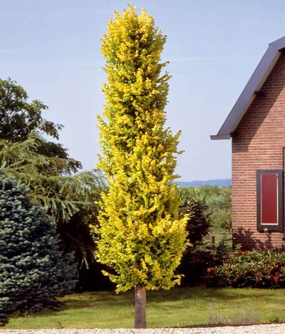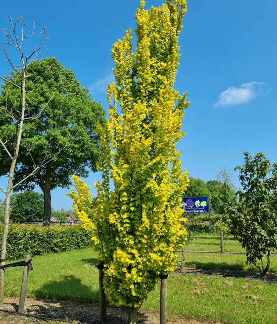 Rośnie jako średniej wielkości drzewo o kolumnowej, zwartej koronie. Docelowo osiąga około 4-5 m wysokości i niewielkiej szerokości. Pędy są wzniesione, a korona regularna i gęsta. Liście wiosną i latem mają intensywnie żółty kolor, z czasem przechodzący w żółtozielony. Jesienią przebarwiają się na jaśniejsze, ciepłe odcienie, zachowując dekoracyjny wygląd do końca sezonu.