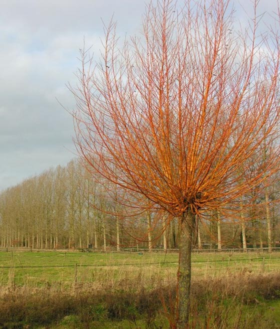 Wierzba biała Chermesina (Salix alba 'Chermesina') to szybkorosnące drzewo liściaste o dekoracyjnych, czerwonych pędach, idealne do dużych ogrodów, parków i nasadzeń przy wodzie.