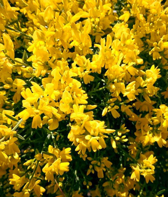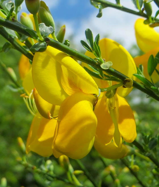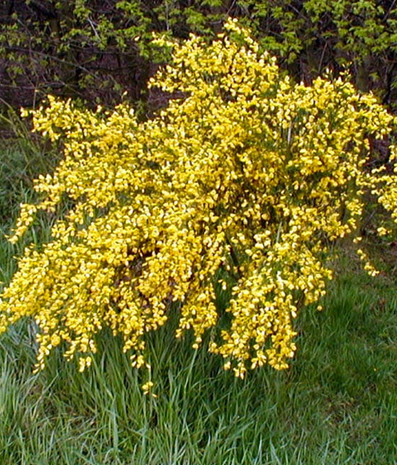 - Kwiaty: Kwiaty są intensywnie żółte, motylkowe, pojawiające się wczesną wiosną, tworzące efektowne grona na całej roślinie.