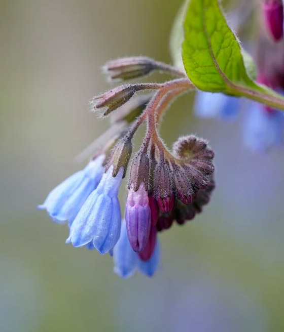 Kwitnienie rozpoczyna się w maju i trwa do lipca. Kwiaty mają dzwonkowaty kształt i intensywny niebieski kolor, zebrane są w grona na szczytach pędów, co tworzy efektowny wizualnie akcent. W czasie kwitnienia roślina wydziela delikatny, lekko miodowy zapach, który przyciąga pszczoły, trzmiele i inne owady zapylające.
